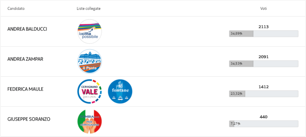 Cervignano del Friuli, dopo oltre trent’anni di buon governo della città da parte della lista Il Ponte, passa al centrodestra. Ventidue voti di scarto premiano il candidato Andrea Balducci, che guida una coalizione composta da tutte le forze politiche della destra che guida la Regione Friuli Venezia Giulia.
