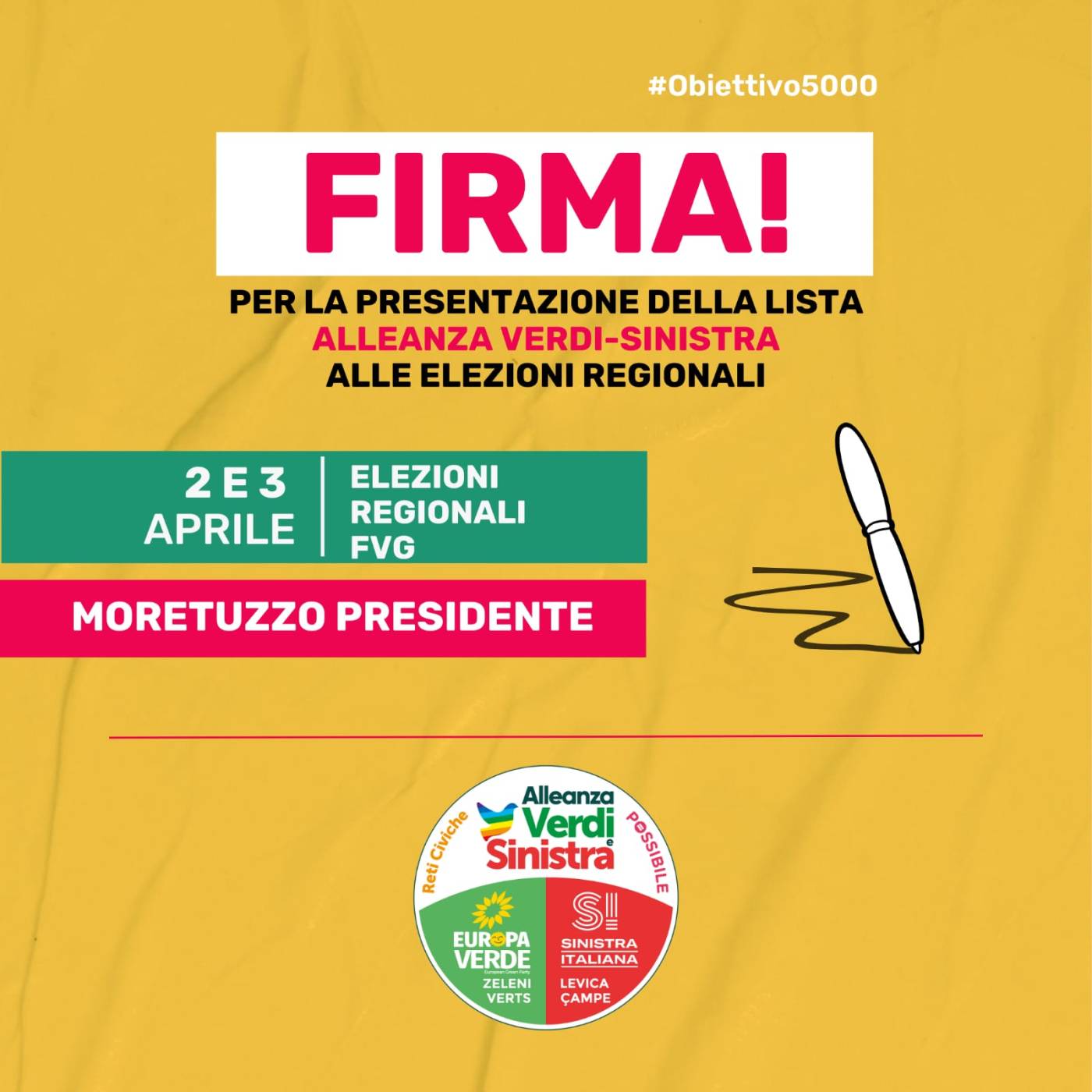 Alleanza Verdi Sinistra (Sinistra Italiana, Possibile, Europa Verde-Verdi) continua la raccolta firme per raggiungere l’obiettivo delle oltre 5000 in tutta la regione per presentarsi alle prossime elezioni del 2 e 3 aprile a sostegno di Massimo Moretuzzo.