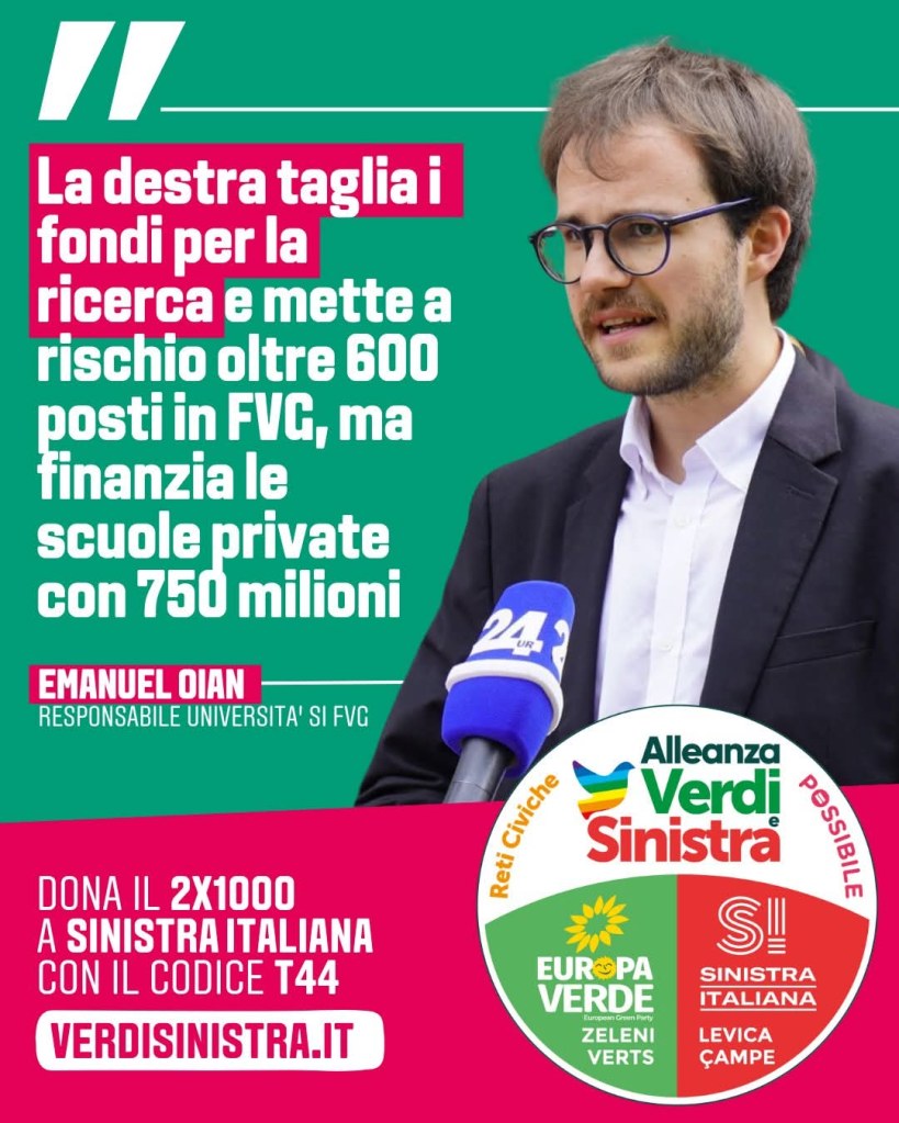Nel solidarizzare con la ricerca in lotta notiamo come le risorse per le scuole private vengano aumentate fino a 750 milioni dal ministro Valditara. Una scelta ideologica che aumenta le diseguaglianze. Meloni, Bernini e Valditara continuano a fare scelte di classe umiliando la ricerca, l’università e la scuola pubblica del nostro Paese e della nostra Regione.”