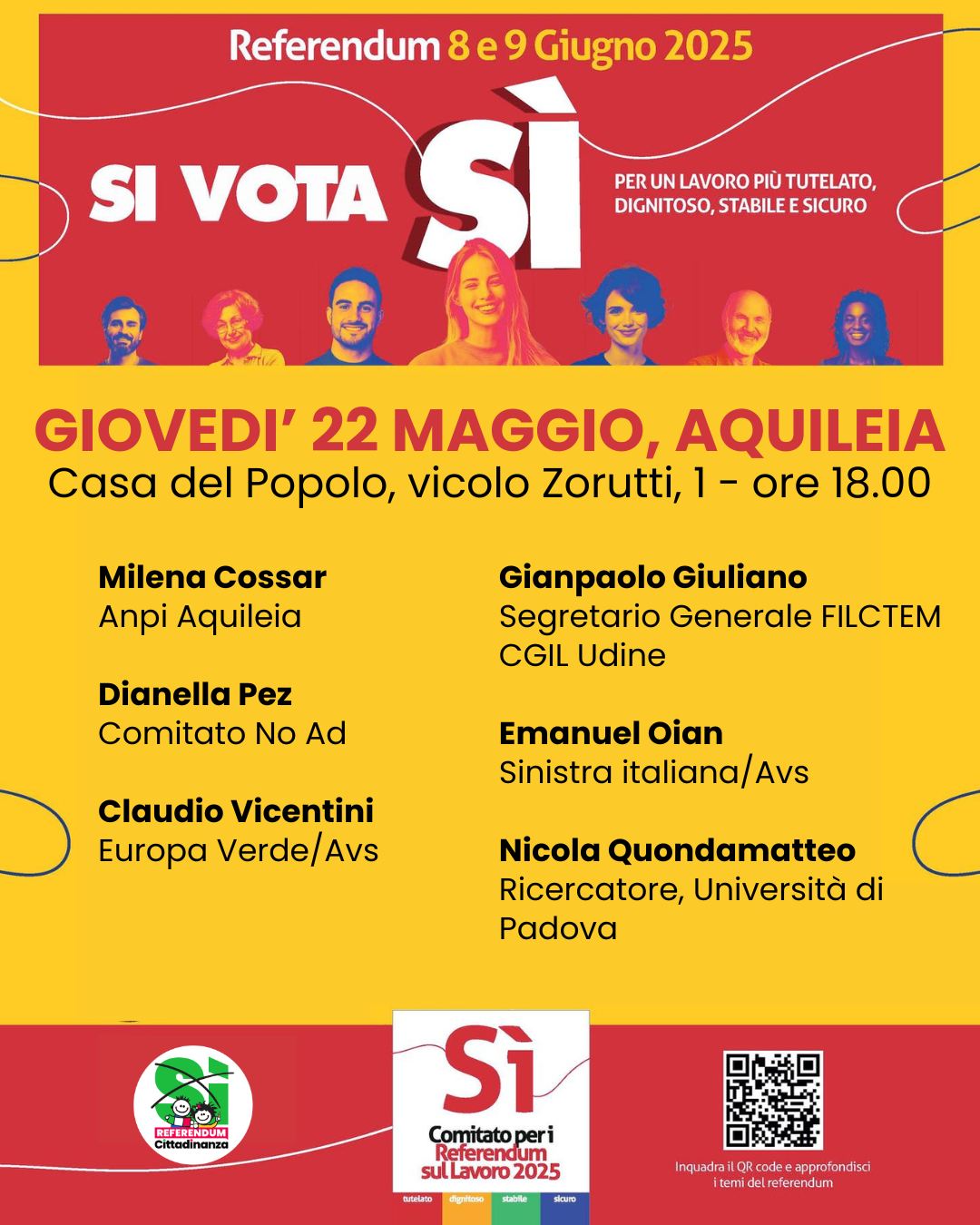 Sinistra italiana / Alleanza Verdi-Sinistra organizza un incontro a tema referendum questo giovedì 22 maggio presso la Casa del Popolo in vicolo Zorutti 1 ad Aquileia